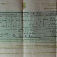 Copy of Marriage certificate between S.R.Crockett and Ruth Mary Milner 16th March 1887. Includes the 'fictional' father's name.
