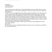 Thanks cousin for excellent letter; glad to see his mother though confined to bedroom with illness; never fully recovered from influenza/malaria before coming home; severe sore throat since Sunday week; doctor forbids work or going out; on lightest diet (slops only); hopes to see cousin's mother Friday though cannot speak much; wishes to talk with cousin before leaving; plans to stay autumn if recovers and settle to work; sends affectionate regards to girls and mother; praises Miss Cannon's kindness during illness